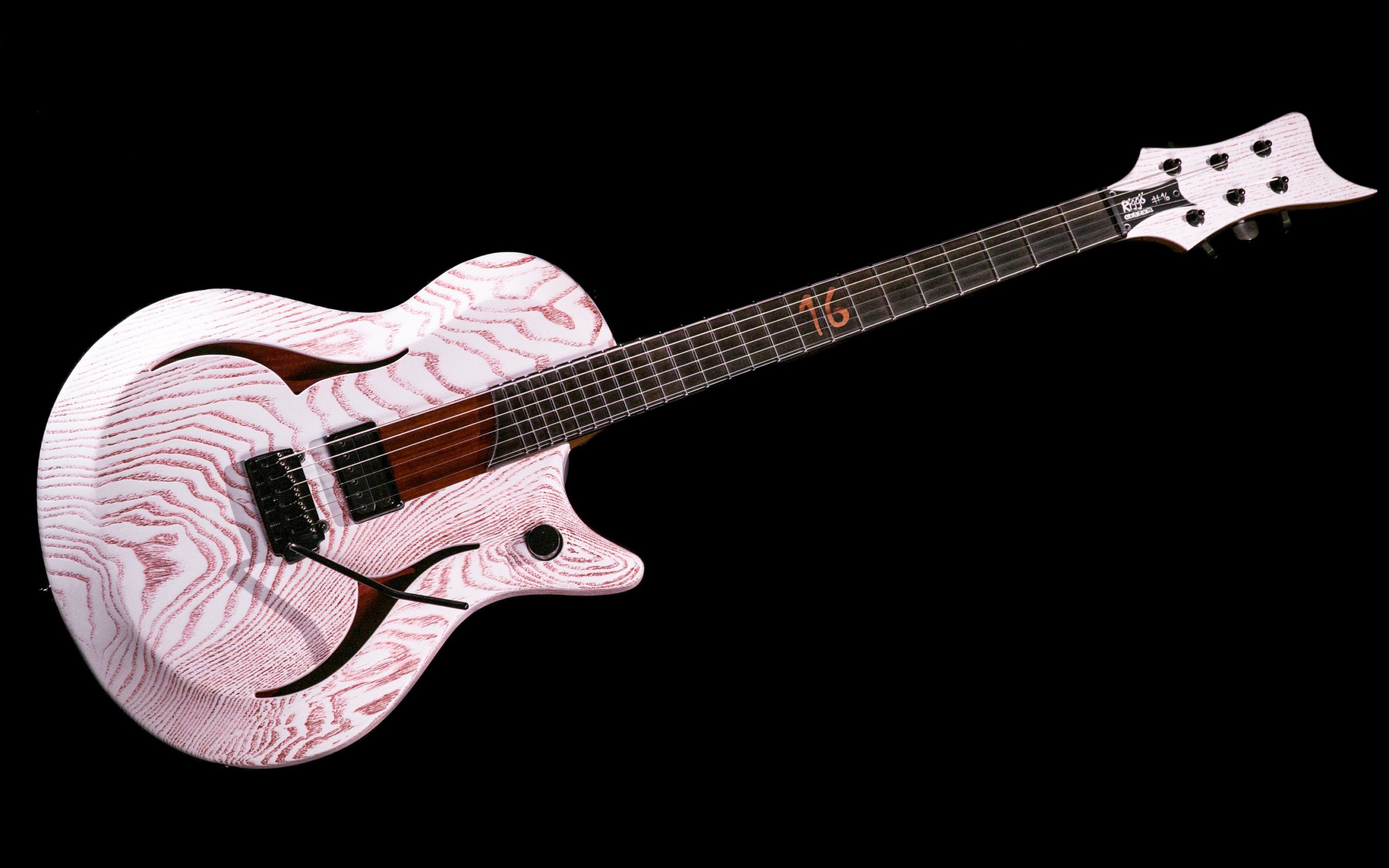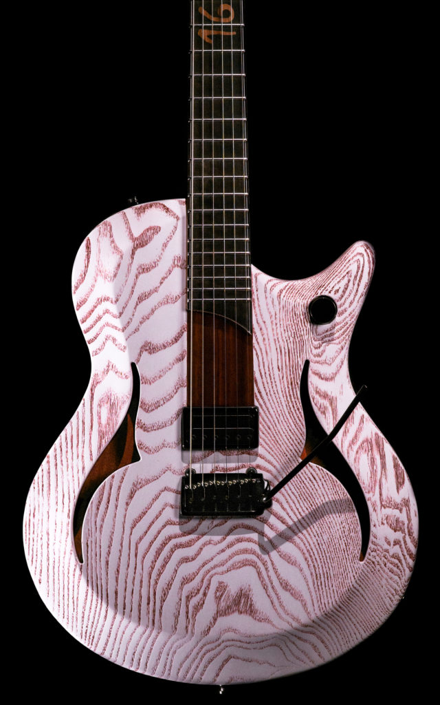 Eine Gitarre für mich! Meine perfekte Livegitarre, die auf alles reduziert ist, was ich anno 2016 als nötig erachtet habe. Durch die Holzkombination klingt sie recht perkussiv und transparent und dennoch kraftvoll, was der DiMarzio MegaDrive Pickup sehr unterstützt. Die Idee zur „Bloody Ash“ Lackierung hatte ich zu dem Zeitpunkt schon sehr lange im Kopf und nach einigen Teststücken kam diese Lackierung hier erstmalig zum Einsatz. Durch die Trennfurniere aus verschiedenen Hölzern sieht sogar die Halsrückseite verzückend aus. Die rückseitige Montage des Pickups ist von außen durch die Abdeckung des Federfachs völlig unsichtbar. Ein elegante Gitarre aus unfassbar schön gemaserter Esche!
