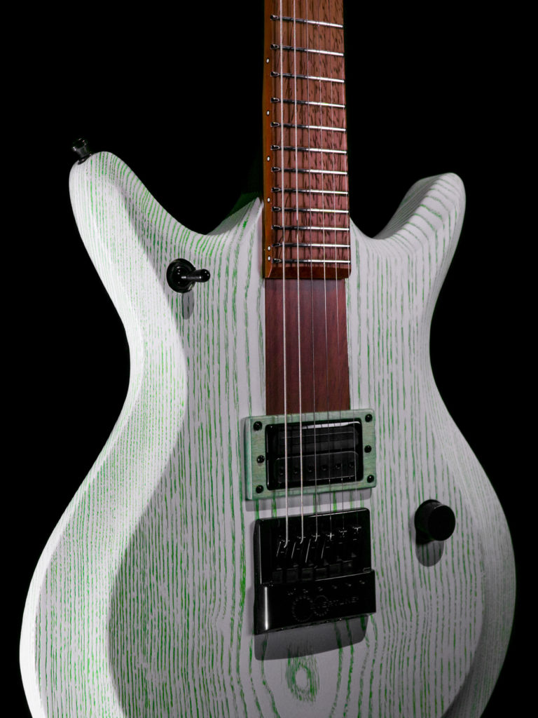 Manchmal reicht die Tatsache, dass ich etwas bestimmtes noch nicht gemacht habe, als Anlass, eine ganze Gitarre zu entwerfen. Ich wollte unbedingt mal ein Evertune System verbauen. Also „klaute“ ich die Form von Gitarre #13, paarte sie mit anderen optischen Highlights anderer Gitarren, fügte noch einige optische Highlights dazu und voilà: Mal wieder ein Einzelstück der Extraklasse. Die Verwendung von Padouk als Griffbrettholz sowie für die Abdeckungen und die „Rallyestreifen“ im Hals ergibt im Zusammenspiel mit der grün-weißen Lackierung ganz besondere Kontraste. Hier kam das erste Griffbrett mit CNC-gefrästen Bundschlitzen zum Einsatz. Der Vorteil daran ist, dass man auch ohne Griffbrettbinding seitlich keine durchgehenden Bundschlitze sieht. Kleine Details, die bei Custominstrumenten zählen. Der 3-Wegeschalter dient als Killswitch, das Volumepoti ist als Push/Push ausgeführt so dass der Pickup gesplittet werden kann. Das Evertune-System sorgt selbst bei starker Belastung und großen Temperaturunterschieden für durchweg stabile Stimmung, allerdings nimmt man sich auch etwas Dynamik und Charakter aus seinem Gitarrenspiel. Man muss es mögen, aber es funktioniert wirklich gut und hält, was es verspricht.