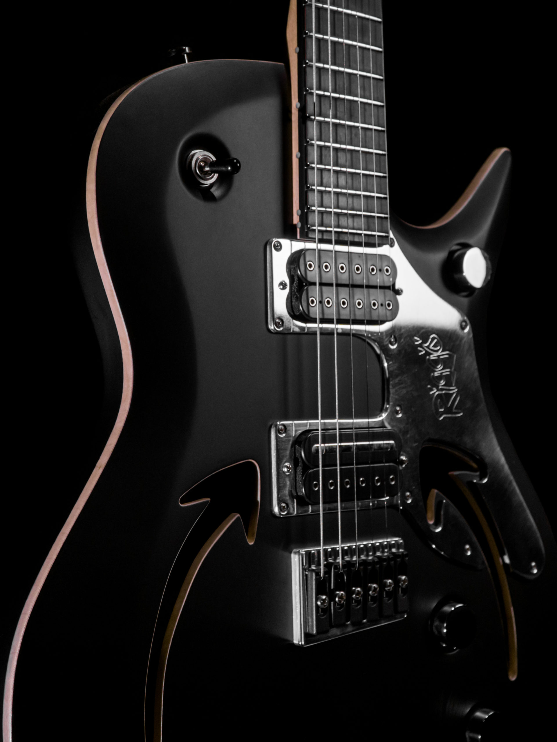 Die erste Gitarre, die ich im Jahre 2014 für einen eventuellen Verkauf und nicht für meinen eigenen Bestand gebaut habe. Das große Alu-Pickguard, welches gleichzeitig als Pickupbefestigung dient, ist hierbei ein besonderer Blickfang. Da ich damals mit dem ursprünglichen Hals aus verschiedenen Gründen nicht zufrieden war, habe ich ihr 2019 einen neuen Hals spendiert. Dabei verwendete ich erstmals „Richlite“ als Griffbrettmaterial. Durch in im Vergleich zu vorher dickeren Hals klingt sie deutlich „voller“ als zuvor, klanglich würde ich ihren Charakter zwischen ausgewogen und transparent ansiedeln. Jeder Pickup hat ein eigenes Volumepoti, dazu gibt es ein Mastervolume. Die Auswahl des Pickups erfolgt über einen 3-Wegeschalter, wie man ihn üblicherweise an einer Les Paul findet.